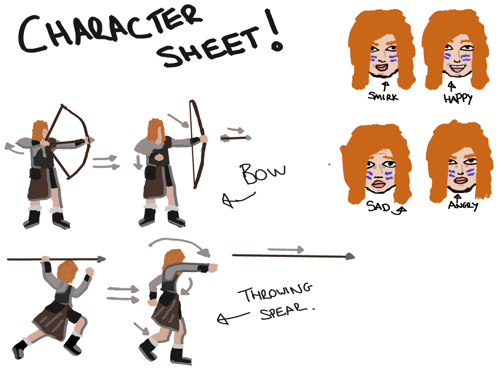 I will probably go back and finish this. This was a very difficult task for me as i cant draw faces, s other next move for me was to make them like a cartoon. On the brief for are character sheets they said it would be similar to the model sheet in the fact that we don't need to add value to the designs, these are just used to get a basic understanding of the atmosphere around the character and to show modelers and animators how the character moves. In this example i have shown how she uses her spear and long bow.