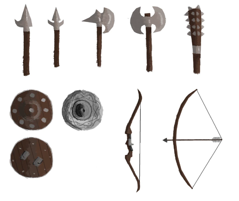 The next stage for me was to decide what she was going to hold or use. I started off by doing a wide range of primary weapons. In my mind i already knew that i wanted her to have something in combination with a shield. After i finished these top 5 i decided that i would like my character to have a spear.